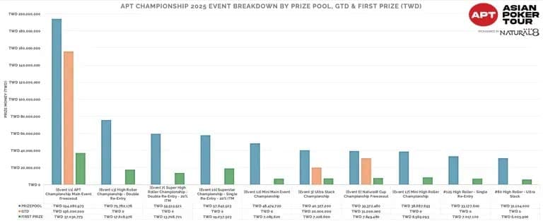 系列赛的焦点——311,000新台币(约10,000美元)的 APT 冠军主赛事,以671人次的亮眼数据,缔造了1.94亿新台币(约620万美元)的巨额奖池,成为近十年来,拉斯维加斯之外,规模最大、奖池最高的万元级别赛事,也是亚洲史上规模最大的主赛事,更是APT历史上奖池最高的锦标赛。