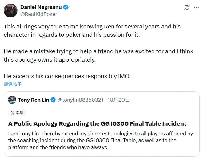 事发后,同为GG Poker大使的Daniel Negreanu在X(原推特)上发文,肯定了Lin负责任的态度。