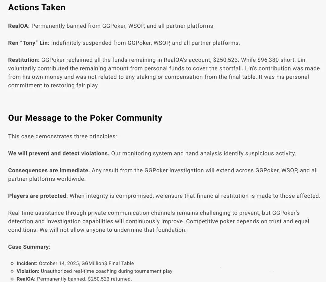 不到一周后,GGPoker发布正式声明:“RealOA”被永久封禁,而Ren Lin则被 “无限期停赛”,范围包括GGPoker、WSOP及所有合作平台。