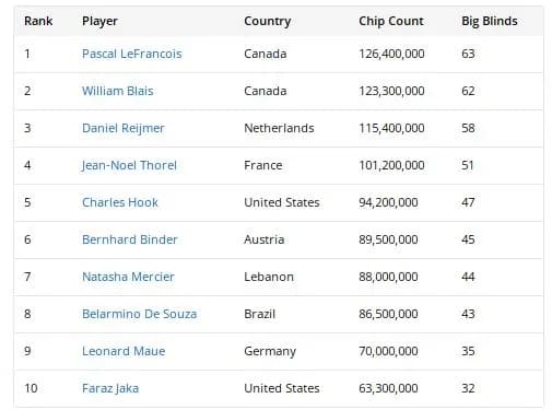 目前领跑的是加拿大选手Pascal LeFrancois,其同胞William Blais则以记分牌量位居第二。Blais在一手关键牌局中手持KK对抗Alex Kulev的AA,并在翻牌击中三条,这手牌创造了赛事至今的最大底池。