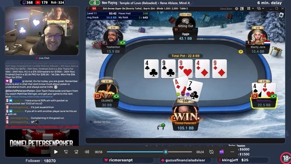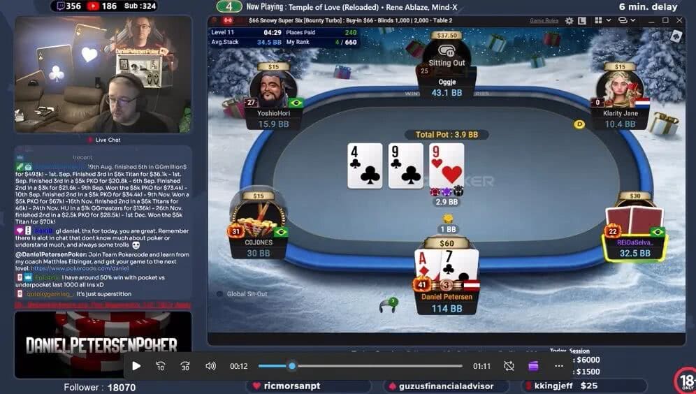 丹麦职业牌手Daniel Petersen日前在网上直播GGPoker一场66刀报名的六人桌赏金快速赛。盲对盲的limp底池,翻牌4♣9♣9♥,Petersen下注1BB,对手REiDaSelva_随即过牌-加注至3.5BB。