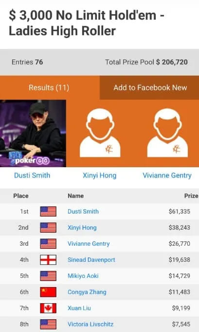 又想起去年夏天在拉斯维加斯永利参加的一场3,000刀女士豪客赛,最后FT第六名。对手包括世界第一女牌手Kristen Foxen、金手链得主冈本诗菜、刘璇以及Victoria Livschitz等。