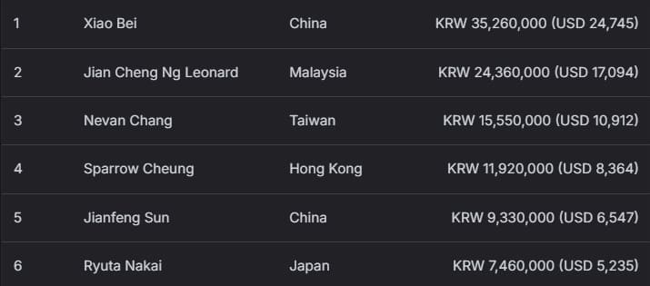 本场赛事前三名均由中国选手包揽!Kaihua Huang 获得亚军,收入 1091 万韩元(约 7656 美元);Xiao Liu 获得季军,赢得 695 万韩元(约 4877 美元),中国选手强势霸屏领奖台。
