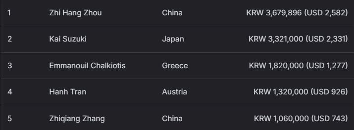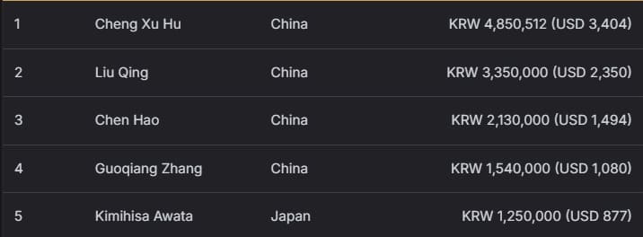 本场赛事前三名同样被中国选手包揽!Liu Qing 获得亚军,收入 335 万韩元(约 2350 美元);Chen Hao 获得季军,赢得 213 万韩元(约 1494 美元),展现中国选手在赛场的统治力。