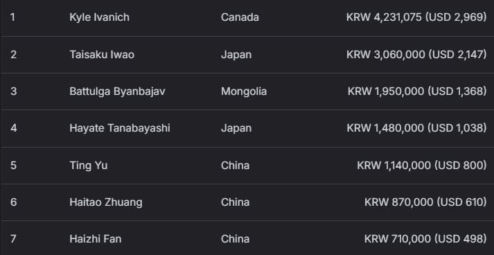 日本选手 Taisaku Iwao表现亮眼但憾获亚军,收入 306 万韩元(约 2147 美元);蒙古选手 Battulga Byanbajav 获得季军,赢得 195 万韩元(约 1368 美元)。