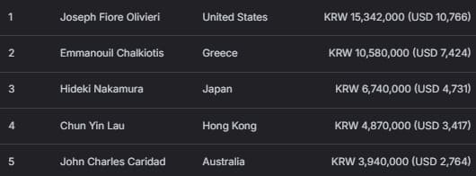 中国选手 Chiyuan You 表现亮眼,获得亚军,收入 880.7 万韩元(约 6180 美元)。同胞选手 Hao Chen 获得季军,赢得 576.6 万韩元(约 4046 美元)。