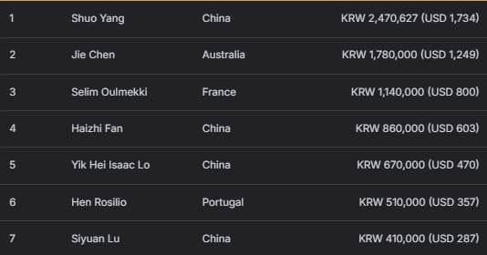中国选手 Haibo Yang 获得亚军,收入 1579 万韩元(约 1.1 万美元)。Zhuoqun Zhang 获得季军,赢得 1113 万韩元(约 7810 美元)。