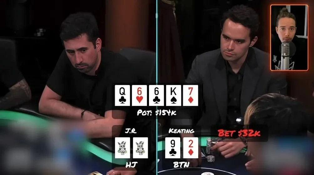 在HCL的一手牌中,牌面是Q♣6♥6♣K♠7♦,Keating以9♣2♦在翻前3-bet,并持续进攻。当底池达到154,000时,他却只下32,000。
