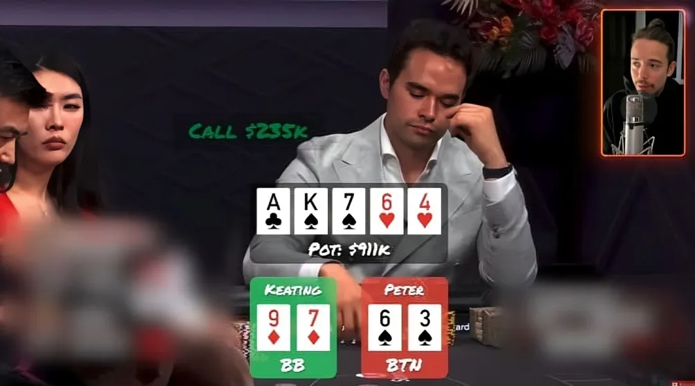 Keating仅持9♦7♦,表面毫无胜算,但他读准对手范围,最终做出惊人跟注,击败Peter的6♠3♠,赢下911,000巨额底池。