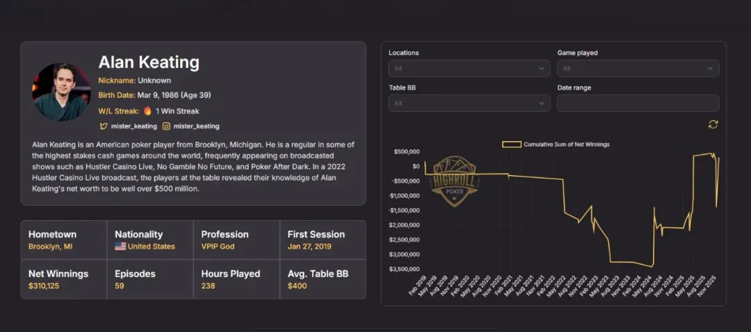 根据HighRollPoker.com数据,Keating在直播高额桌总共打了238小时,累积获利310,125刀;若再加上他在PokerGO“Cash of the Titans”赢得的33.5万,他的直播累积获利已超过69万。
