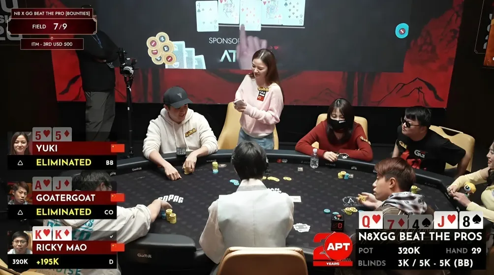 进入五人阶段时比赛节奏明显放缓,整整鏖战一个多钟头。直到茅人及再次拿到KK才终于打破僵局,将Andy淘汰在第四名。