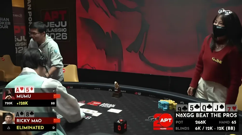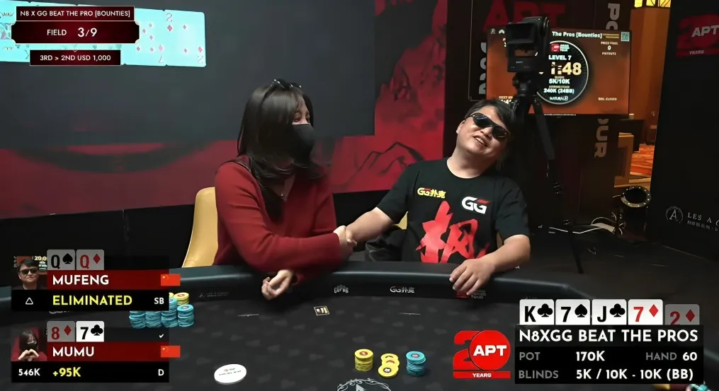 比赛开打约50分钟后迎来首个淘汰,范植威拿到AQo翻前全下,公共牌发出K-Q-9-J-2,不敌木枫的AKo,遗憾止步第九名,也成功解锁第一场Beat The Pros免费赛。