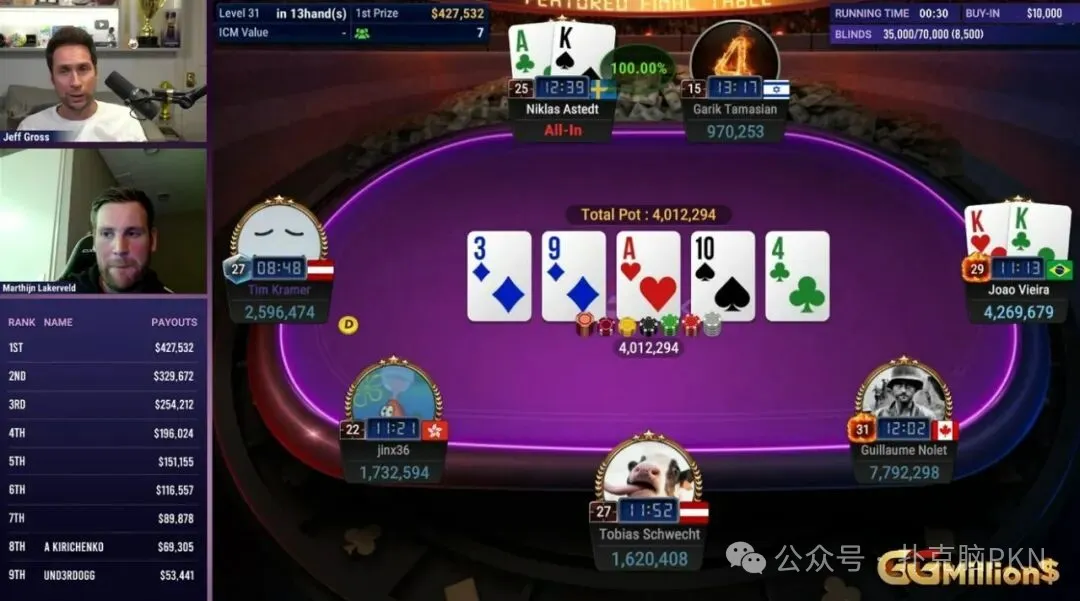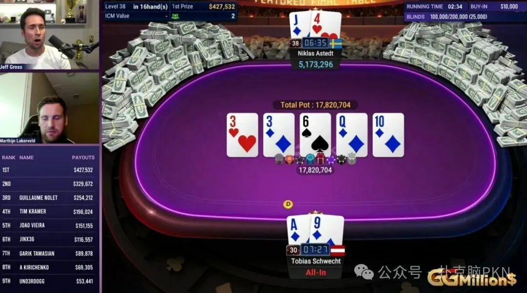 近日,Astedt再次杀入GGMillion$决赛桌,并以中等筹码开启征程。