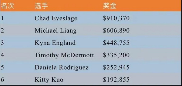 美国职业扑克玩家Chad Eveslage成为了笑到最后的那个人,拿下冠军头衔的同时还带走了$910,370的冠军奖金,这也是他人生中的第一个WPT主赛事冠军头衔。